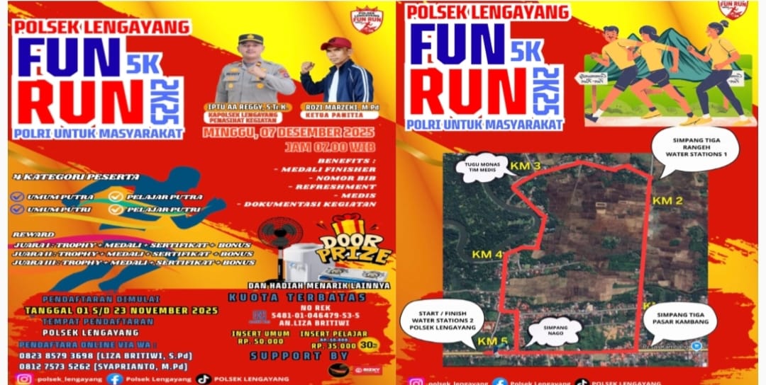 Pendaftaran peserta Fun Run 5K 2K25 dapat dilakukan langsung di Polsek Lengayang hingga tanggal 23 November 2025. Kuota peserta terbatas. Segera daftarkan diri Anda, rasakan semangat kebersamaan bersama Polri, dan jadilah bagian dari momen bersejarah ini.