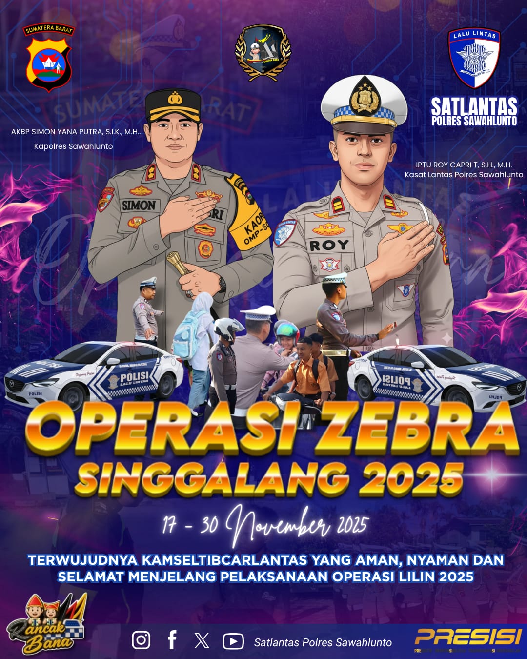 SAWAHLUNTO | Senin, 17 November 2025 menjadi hari dimulainya Operasi Zebra Singgalang 2025 di wilayah hukum Polres Sawahlunto. Kapolres Sawahlunto AKBP Simon Yana Putra, S.I.K., M.H., bersama Kasat Lantas IPTU Roy Capri T, S.H., M.H., menyatakan seluruh personel telah siap mengamankan kegiatan yang berlangsung hingga 30 November mendatang, dengan fokus pada peningkatan keamanan dan ketertiban lalu lintas.