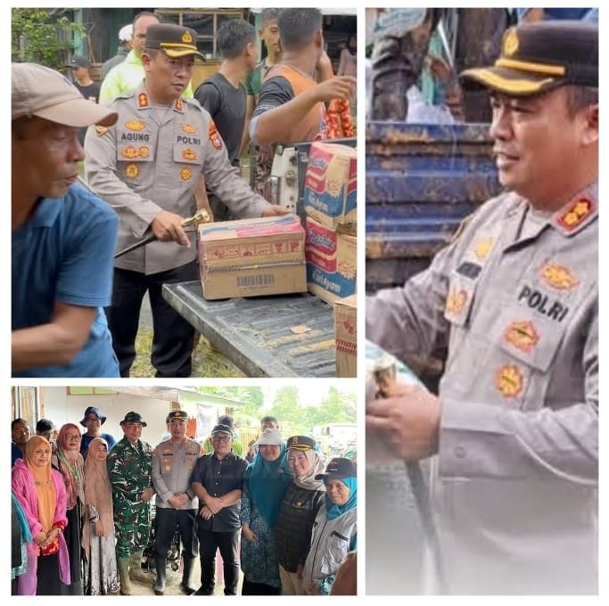 AKBP Agung terlihat mendatangi satu per satu warga yang terdampak. Di beberapa lokasi, ia bahkan harus berjalan kaki melewati jalan berlumpur untuk memastikan bantuan tiba tanpa hambatan apa pun.