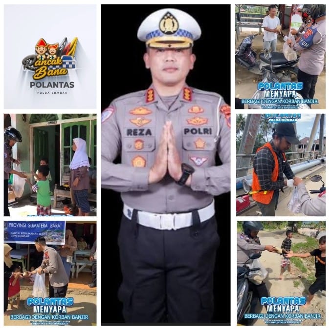Kota Padang | Program Polantas Menyapa kembali hadir membawa pesan kemanusiaan ketika hujan deras mengguyur Kota Padang dan menyebabkan banjir di sejumlah titik. Pada Rabu 3 Desember 2025, jajaran Direktorat Lalu Lintas Polda Sumatera Barat turun langsung ke kawasan yang terdampak untuk berbagi bantuan dan memastikan keselamatan warga. Kegiatan ini berada di bawah arahan langsung Dirlantas Polda Sumbar Kombes Pol. H. M. Reza Chairul Akbar Sidiq, S.H., S.I.K., M.H.