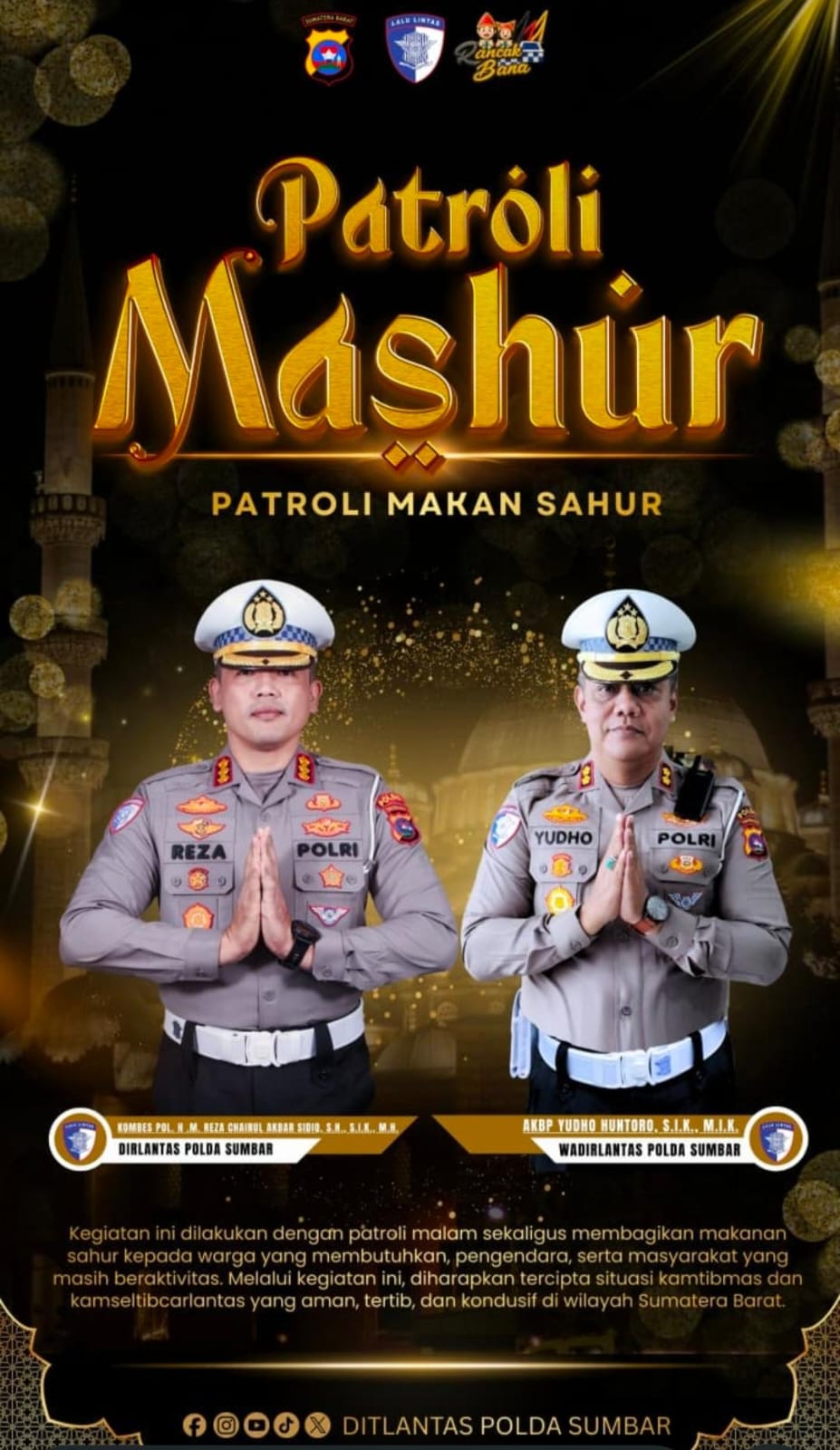 SUMBAR | Suasana dini hari di Sumatera Barat terasa berbeda. Di tengah sunyinya jalanan menjelang sahur, jajaran Direktorat Lalu Lintas Polda Sumbar hadir menyapa masyarakat melalui kegiatan “Patroli Mashur” atau Patroli Makan Sahur. Di bawah komando Direktur Lalu Lintas Polda Sumbar, Kombes Pol H.M. Reza Chairul Akbar Sidiq, S.H., S.I.K., M.H., kegiatan ini menjadi wujud nyata kepedulian sekaligus komitmen menjaga keamanan selama Ramadan.