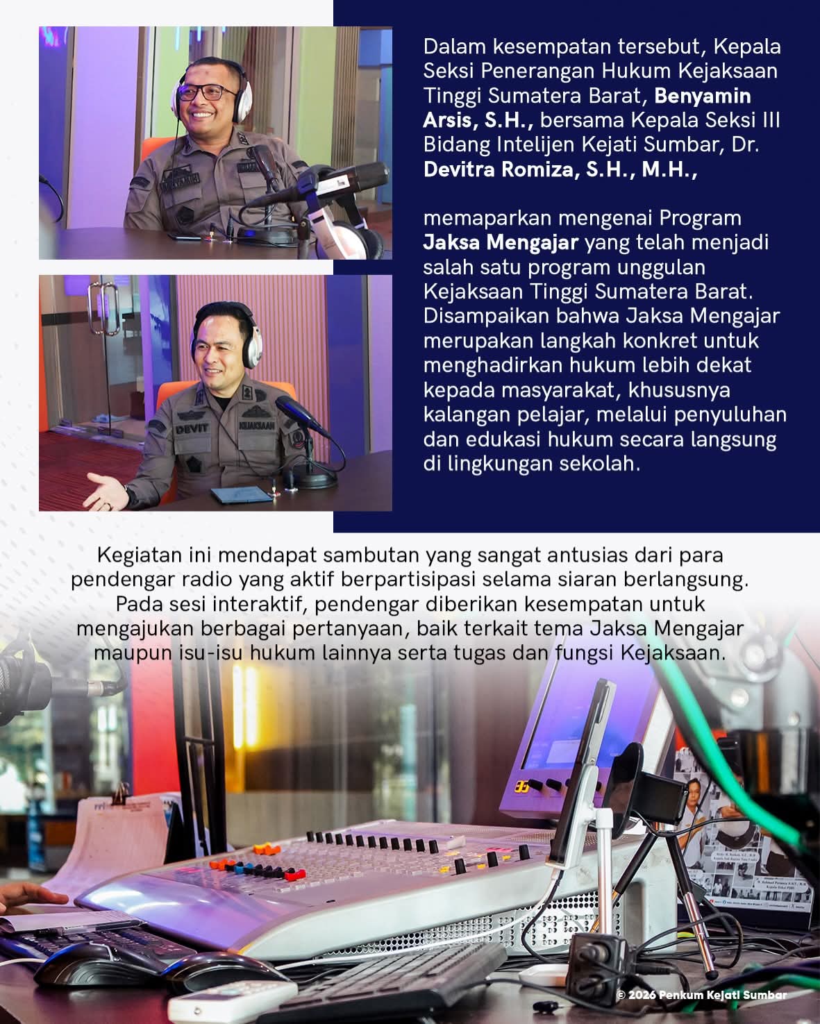 SUMBAR | Suasana siaran di RRI Pro 1 Padang, Kamis (19/2/2026), terasa berbeda. Bukan sekadar dialog rutin, melainkan ruang edukasi yang menghadirkan wajah hukum lebih dekat dan lebih membumi. Kejaksaan Tinggi Sumatera Barat memanfaatkan gelombang radio untuk menyapa masyarakat melalui program “Jaksa Menyapa” dengan fokus pada penguatan Program Jaksa Mengajar.