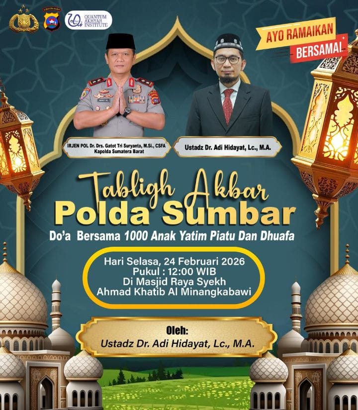 SUMBAR | Polda Sumatera Barat kembali menghadirkan momentum spiritual yang sarat makna melalui gelaran Tabligh Akbar dan doa bersama 1000 anak yatim, piatu, serta dhuafa yang akan dilaksanakan Selasa, 24 Februari 2026, pukul 12.00 WIB di Masjid Raya Syekh Ahmad Khatib Al Minangkabawi.