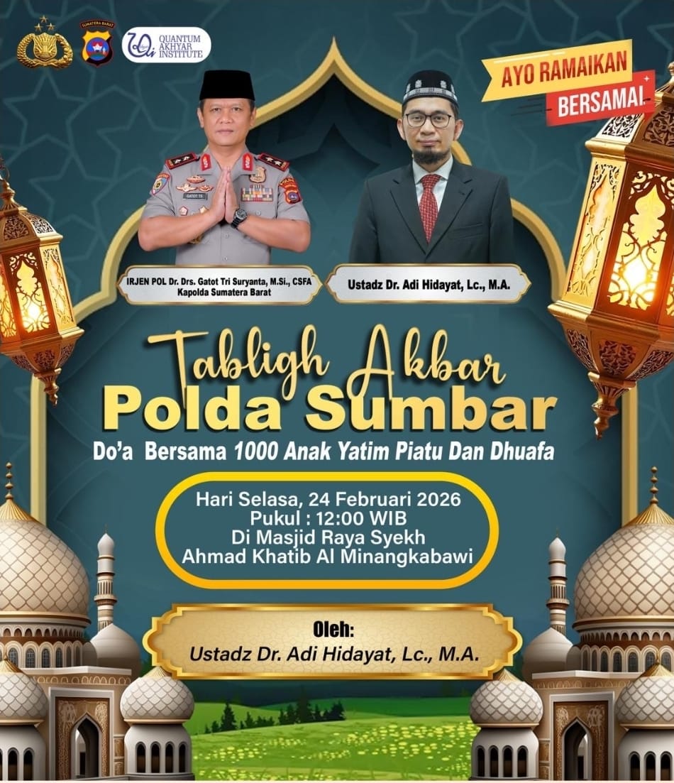Sumbar — Polda Sumatera Barat kembali menghadirkan kegiatan keagamaan penuh makna melalui Tabligh Akbar dan doa bersama 1000 anak yatim, piatu, serta dhuafa yang akan dilaksanakan pada Selasa, 24 Februari 2026, pukul 12.00 WIB di Masjid Raya Syekh Ahmad Khatib Al Minangkabawi, Kota Padang.