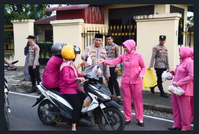 Ketua Bhayangkari Cabang Pasaman Barat bersama pengurus turut membantu membagikan paket takjil kepada masyarakat. Mereka menyapa langsung para pengendara yang berhenti sejenak untuk menerima paket berbuka puasa.