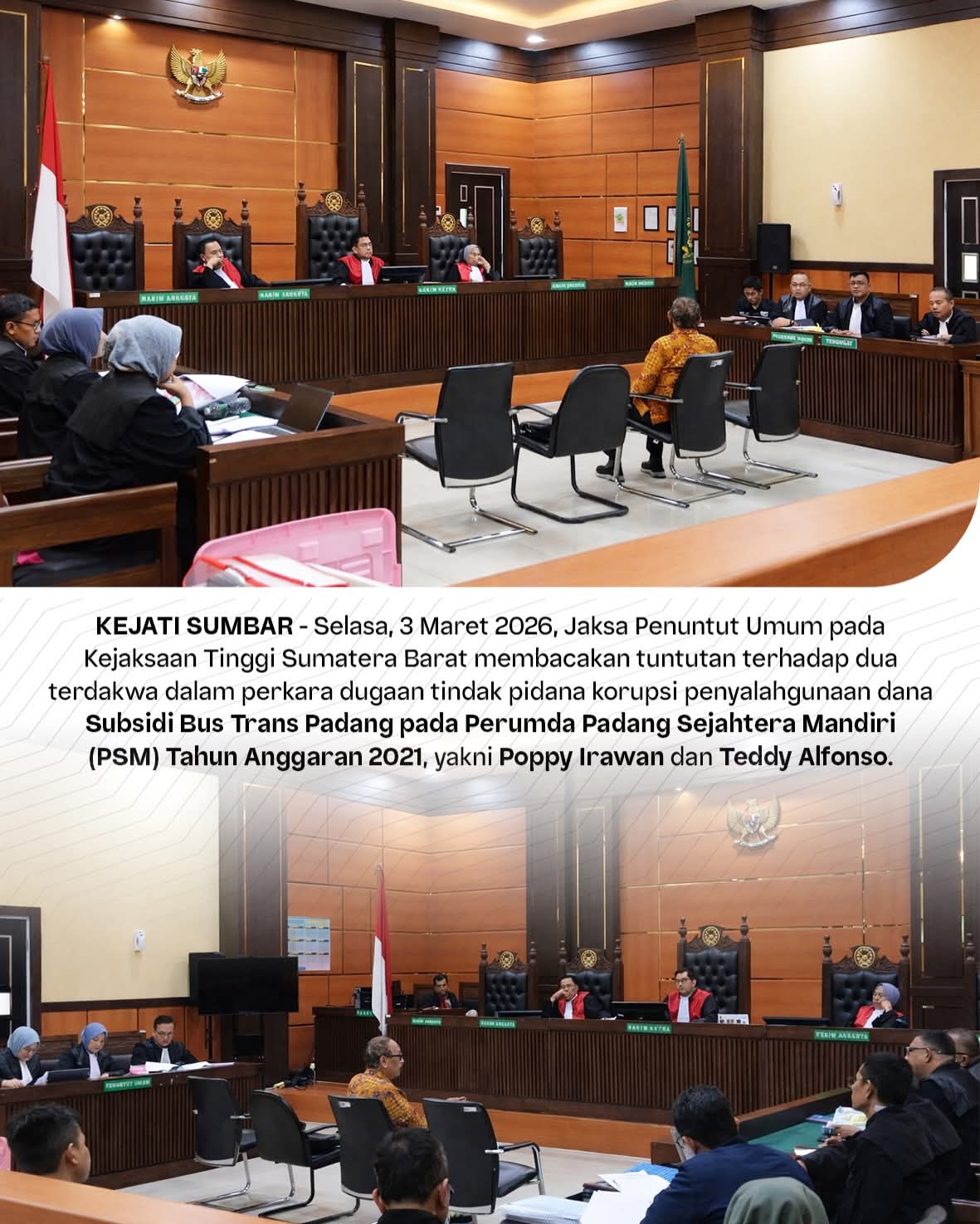 PADANG – Jaksa Penuntut Umum (JPU) dari Kejaksaan Tinggi Sumatera Barat secara tegas membacakan tuntutan pidana terhadap dua terdakwa dalam perkara dugaan tindak pidana korupsi penyalahgunaan dana subsidi Bus Trans Padang pada Perumda Padang Sejahtera Mandiri (PSM) Tahun Anggaran 2021. Tuntutan tersebut disampaikan dalam sidang yang digelar pada Selasa, 3 Maret 2026.
