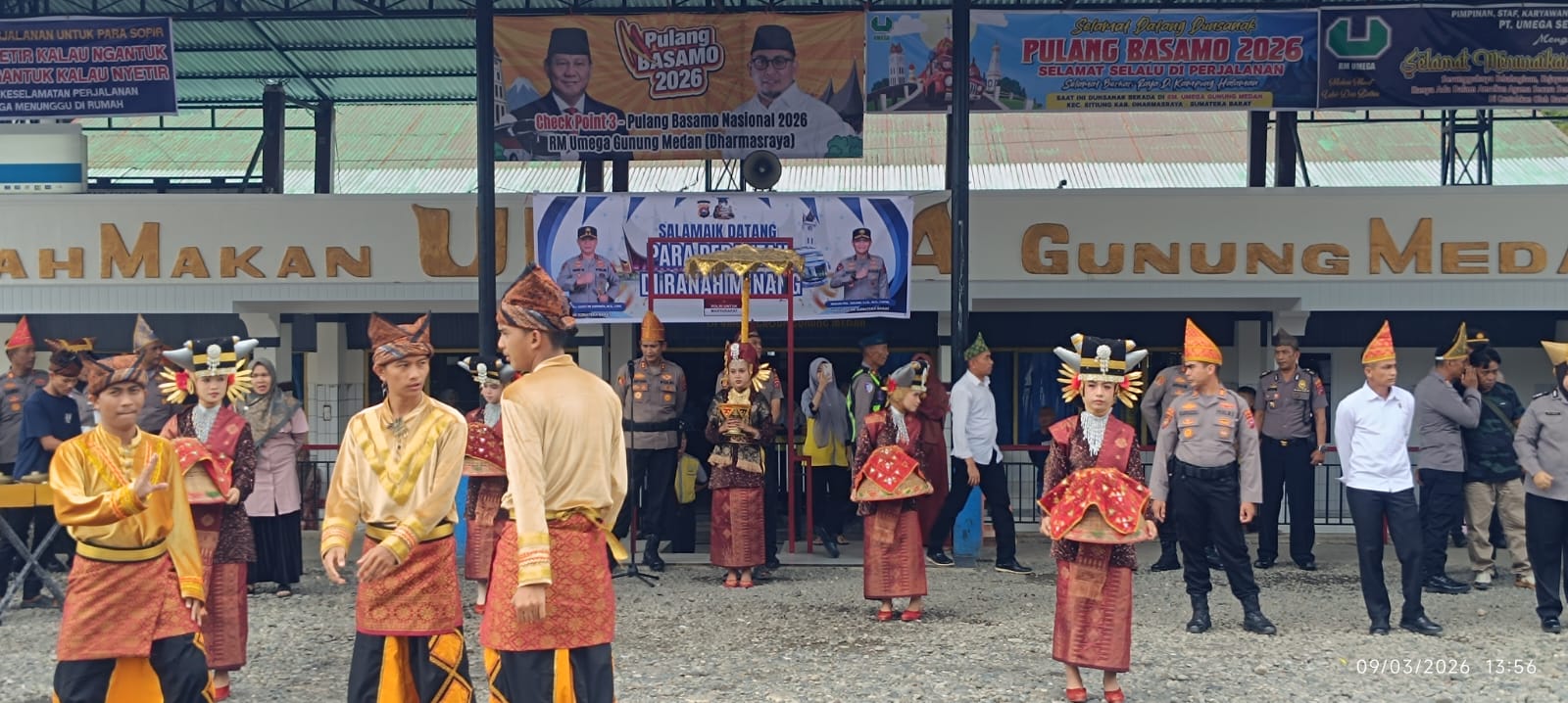 Sumbar — Kepolisian Daerah Sumatera Barat (Polda Sumbar) menunjukkan komitmen pelayanan humanis dalam menyambut kepulangan warga perantau Minang. Kloter pertama program Pulang Basamo 2026 resmi disambut di Rumah Makan Omega Gunung, Kecamatan Sitiung, Kabupaten Dharmasraya, Senin (9/3/2026) sore.