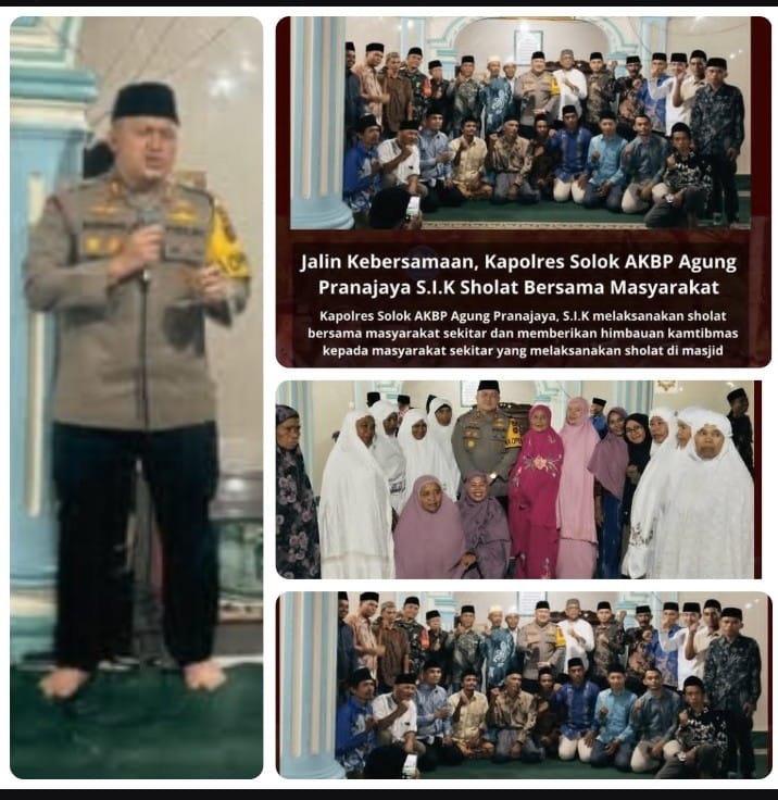 KAB. SOLOK | Momentum bulan suci Ramadhan dimanfaatkan Kapolres Solok AKBP Agung Pranajaya, S.I.K untuk semakin mendekatkan diri dengan masyarakat. Pada Selasa, 18 Maret 2026, ia melaksanakan sholat berjamaah bersama warga di masjid, sekaligus menyampaikan pesan-pesan kamtibmas dalam suasana religius yang penuh kekhusyukan.