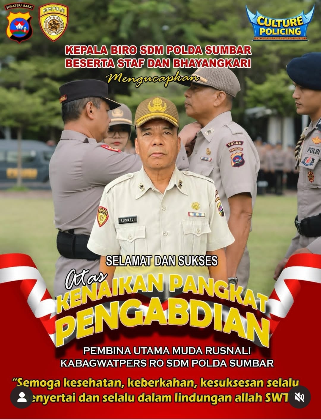 Momentum kenaikan pangkat tersebut disambut hangat oleh jajaran Biro SDM Polda Sumbar, staf, serta Bhayangkari yang turut memberikan apresiasi atas pengabdian panjang yang telah ditorehkan. Ucapan selamat dan doa mengalir sebagai bentuk penghormatan atas capaian yang dinilai luar biasa ini.