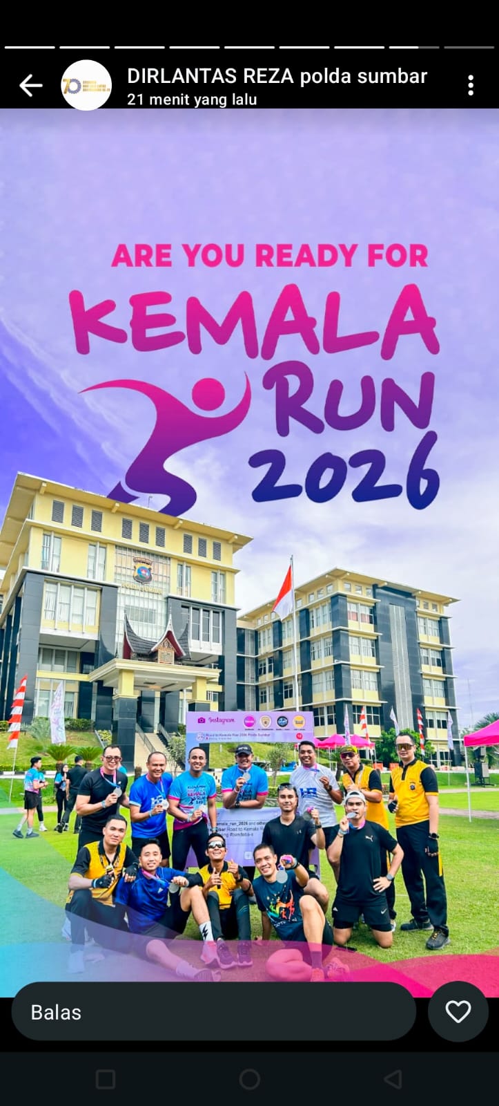 SUMBAR | Semangat kebersamaan dan gaya hidup sehat kembali digaungkan di Sumatera Barat melalui agenda Kemala Run 2026 yang dipromosikan langsung oleh Dirlantas Polda Sumbar, Reza. Kegiatan ini tidak hanya menjadi ajang olahraga, tetapi juga sarana mempererat hubungan antara kepolisian dan masyarakat dalam suasana yang lebih santai dan penuh energi positif.